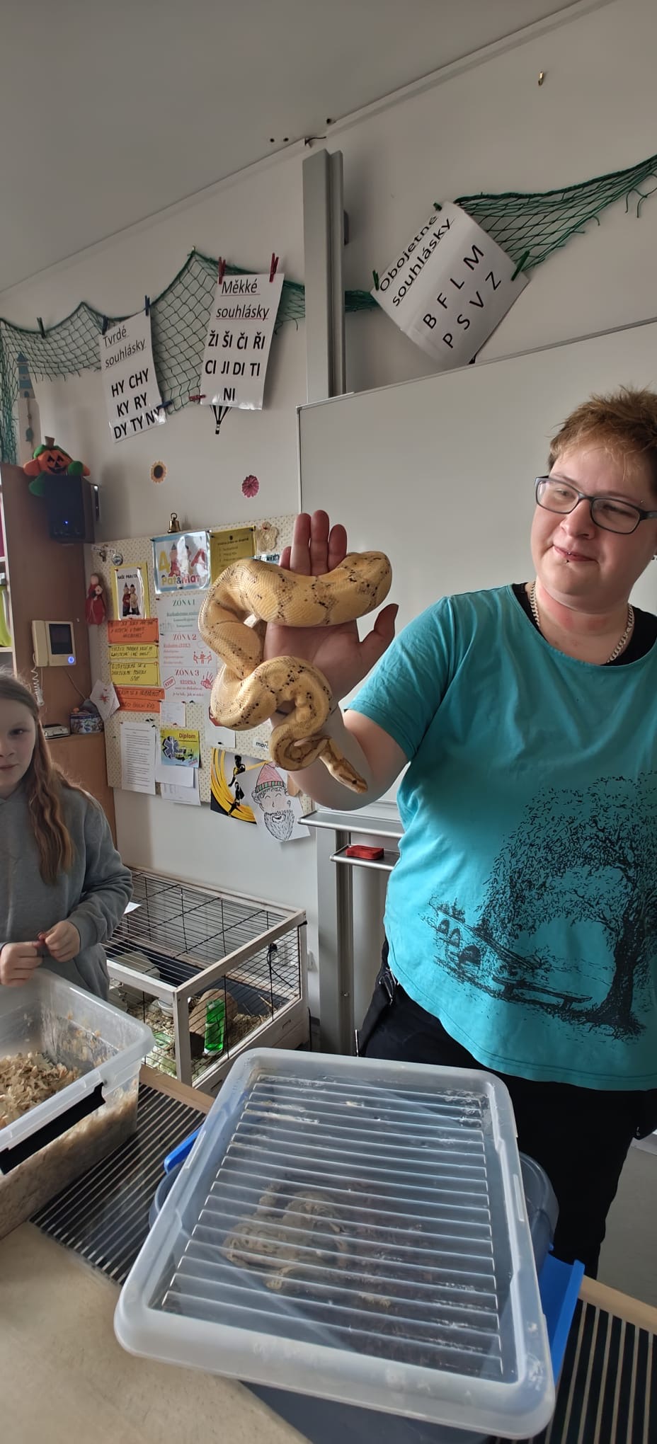Dětem přinesla na ukázku 4 druhy hadů. Poutavě jim vyprávěla o jejich chovu, životě, krmení, rozmnožování.